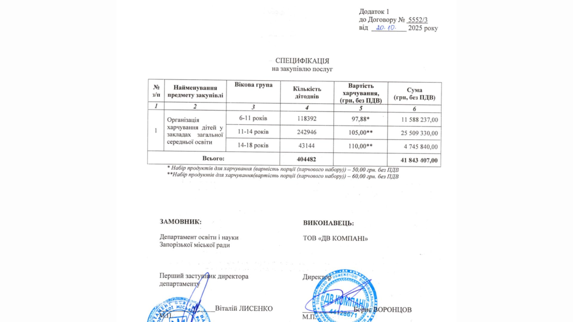 Тоді фірма мала забезпечувати їжею школи до 31 березня. Зараз, свіжим договором, кейтерингові послуги «ДВ Компані» продовжили до 31 грудня 2025 року.