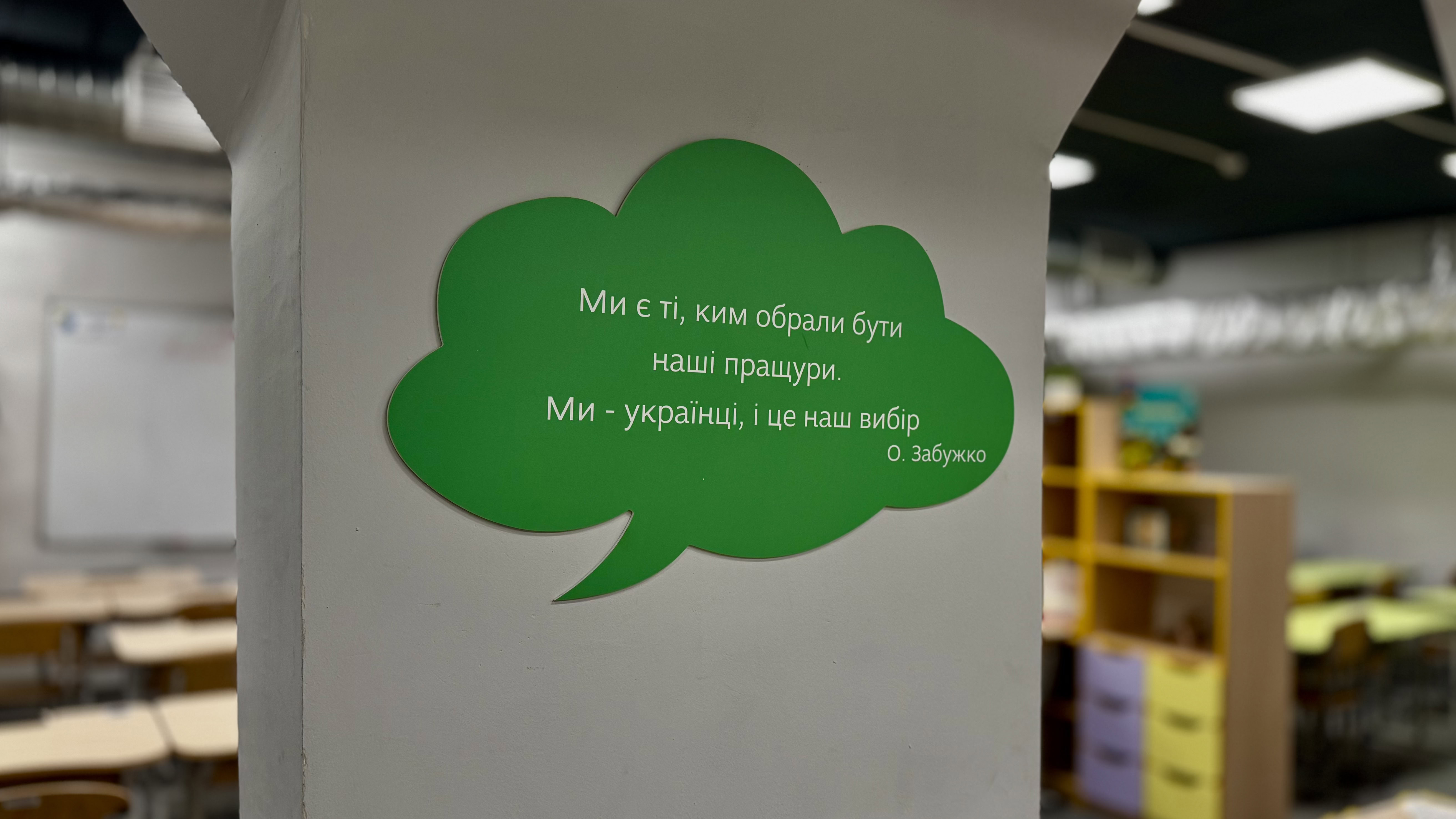 Білий колір стін розбавляють різнокольорові елементи та цитати відомих українців.