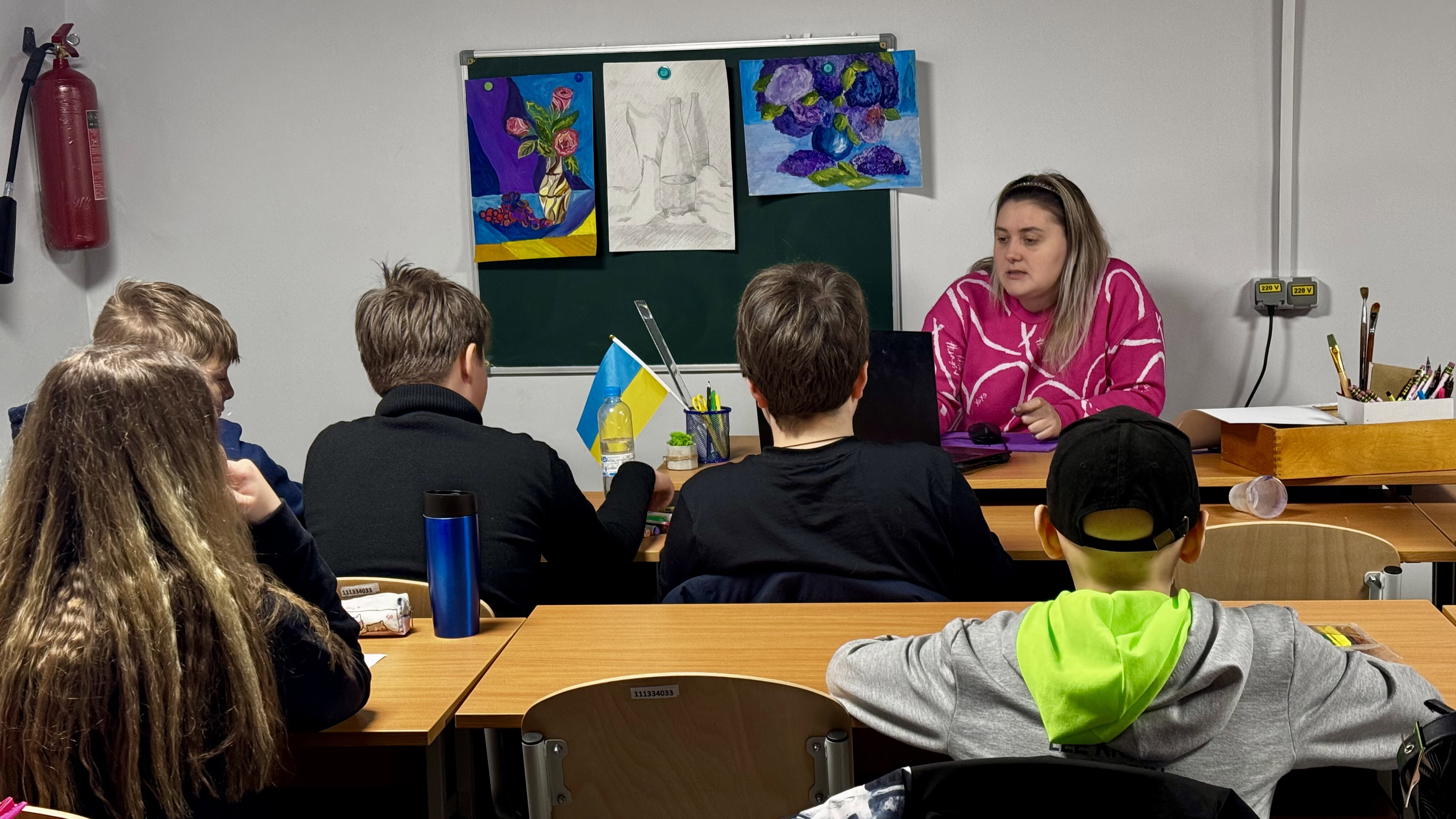 Аби не заважати, тишком проходимо повз занять з малювання. Пенали переповнені олівцями, на дошці натюрморти квітів.
