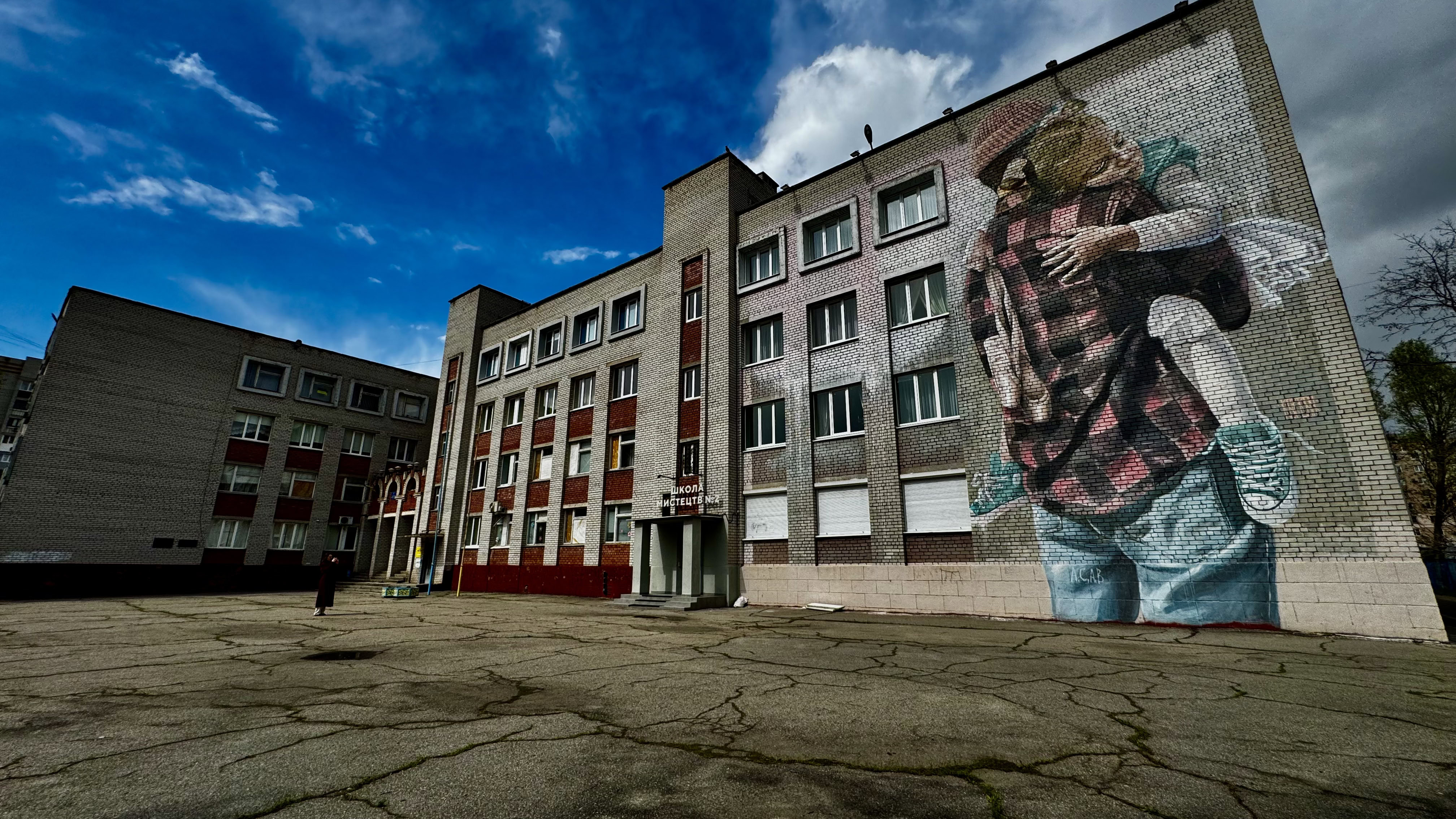 Тоді це зображення, мабуть, асоціювалося зі святом першого вересня або як тато забирає доньку після уроків. Тепер, після 2022-го, коли в цю школу, шукаючи прихистку, з’їжджалися-сходилися тисячі людей, мурал пробуджує шквал інших емоцій. Коли треба було хапати дітей, речі і швидко виїжджати.