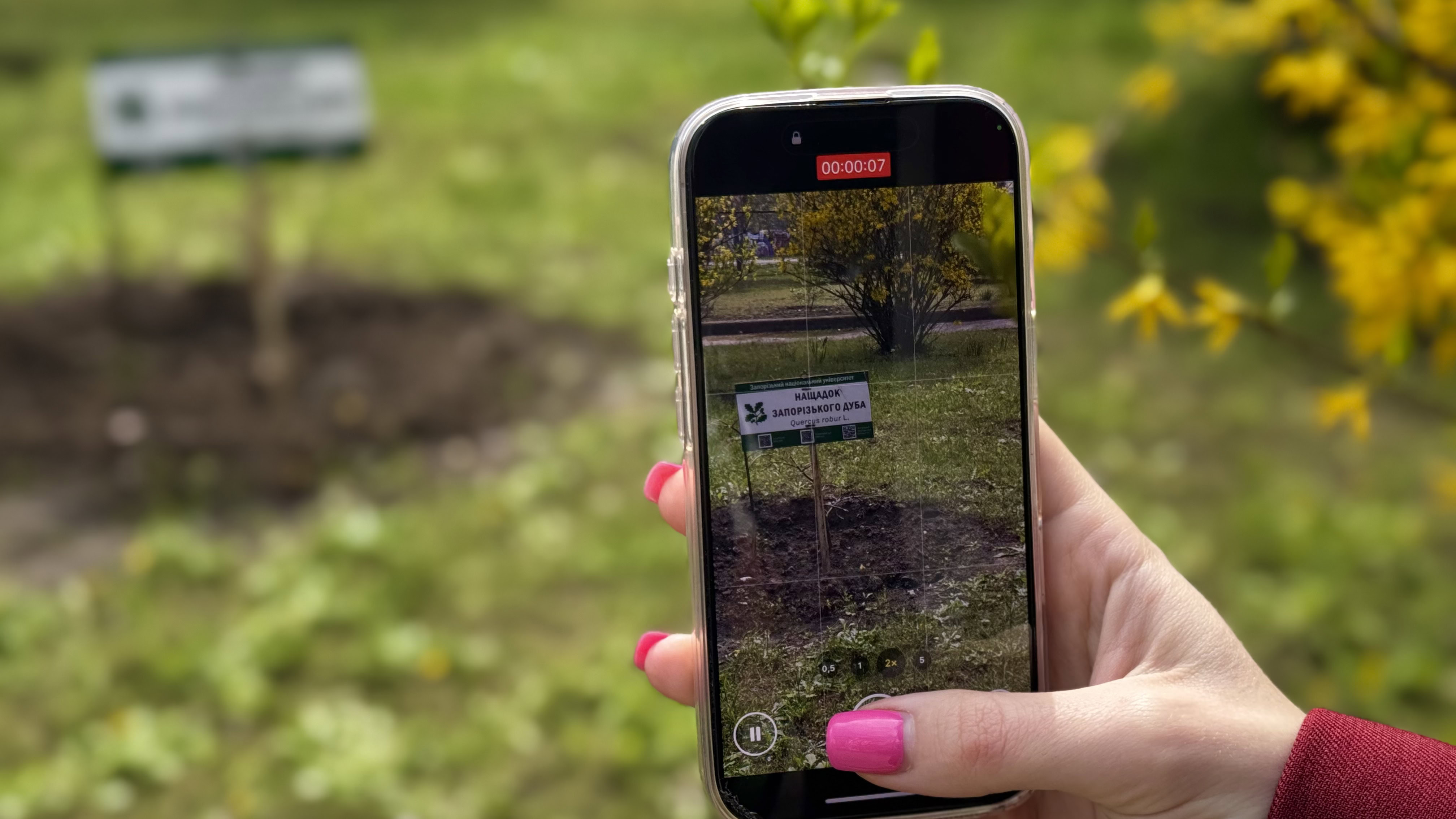 Серед рівно висаджених кущів, наче у захисті, мирно росте нащадок запорізького дуба.