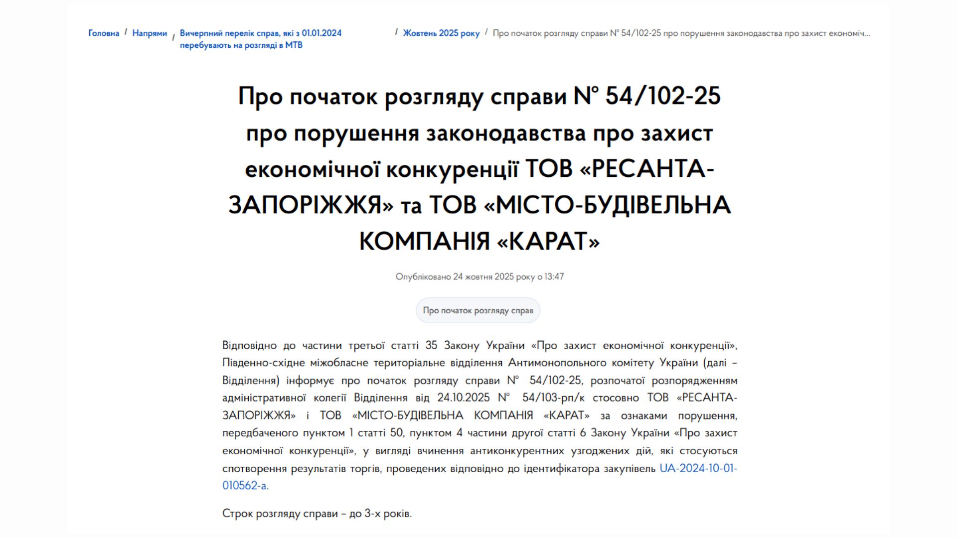 24 жовтня цього року Антимонопольний комітет на своєму сайті повідомив, що починають розгляд справи стосовно фірм «Ресанта-Запоріжжя» та «Місто-будівельної компанії “Карат”» за ознаками порушення економічної конкуренції. Тобто під час закупівлі фірми, вірогідно, могли домовитися, щоб спотворити результати торгів.
