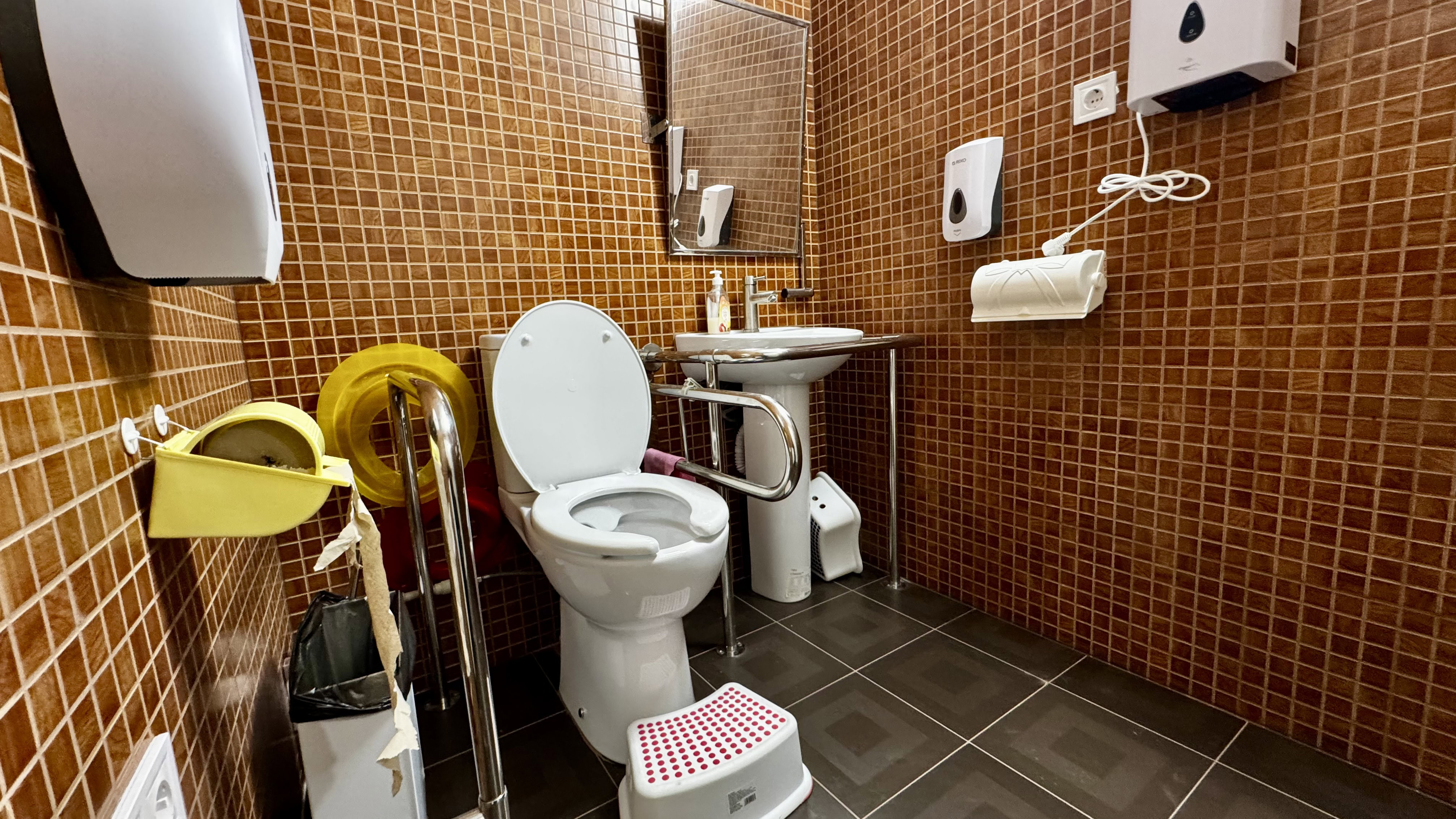 Облаштована окрема вбиральня з поручнями, широким проходом, дзеркалом під нахилом. Однак місця для маневру на кріслі колісному замало.