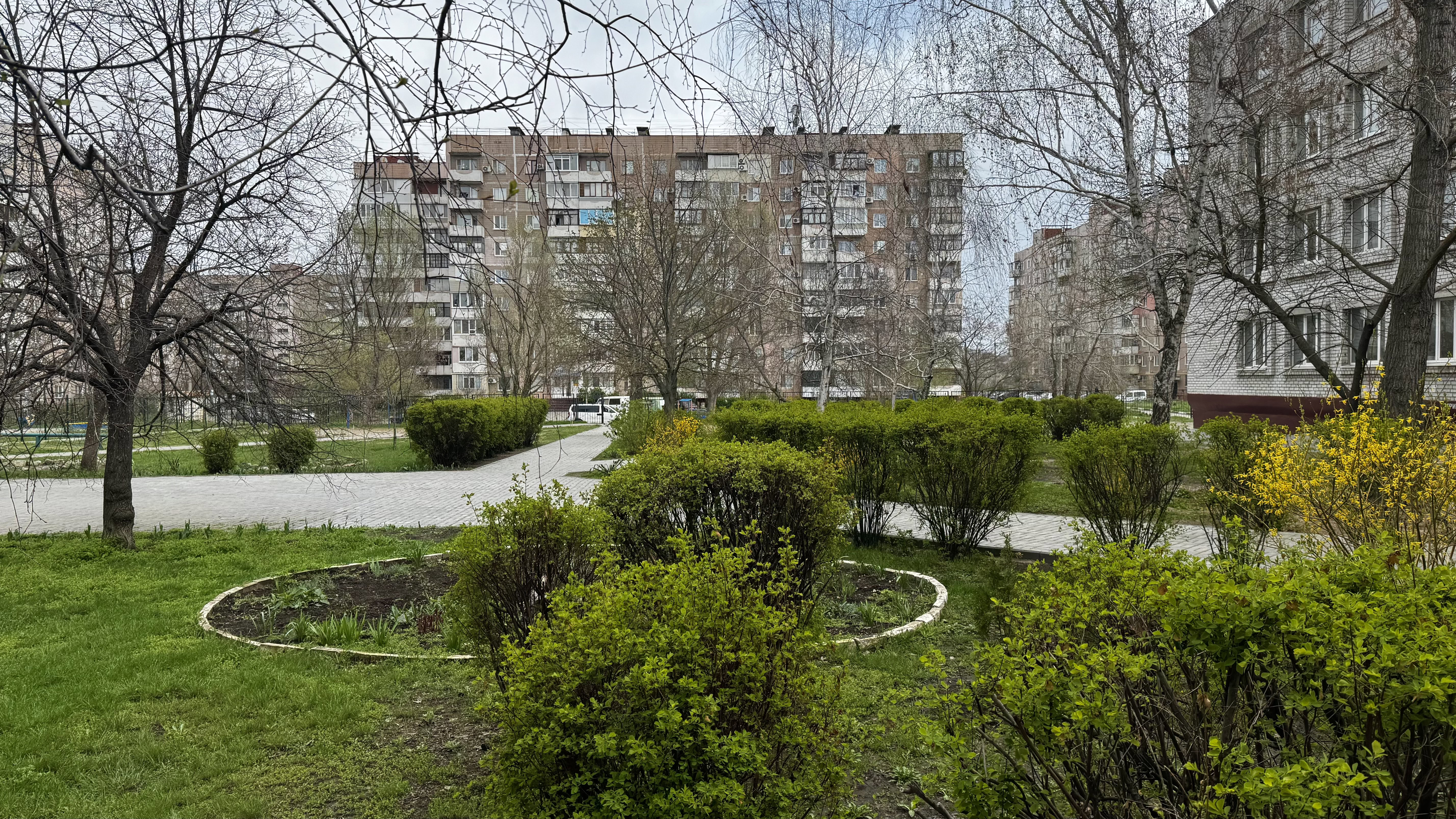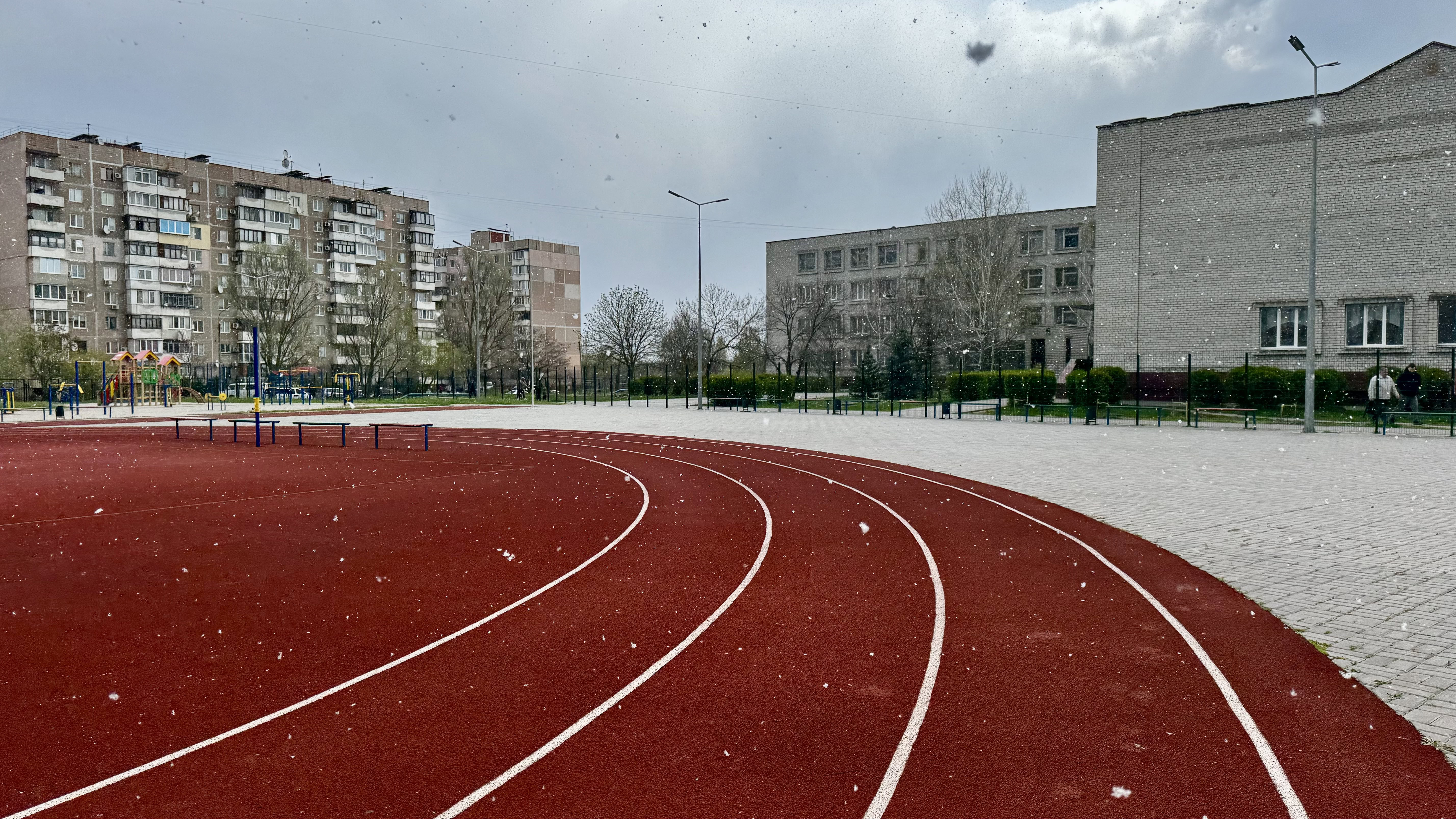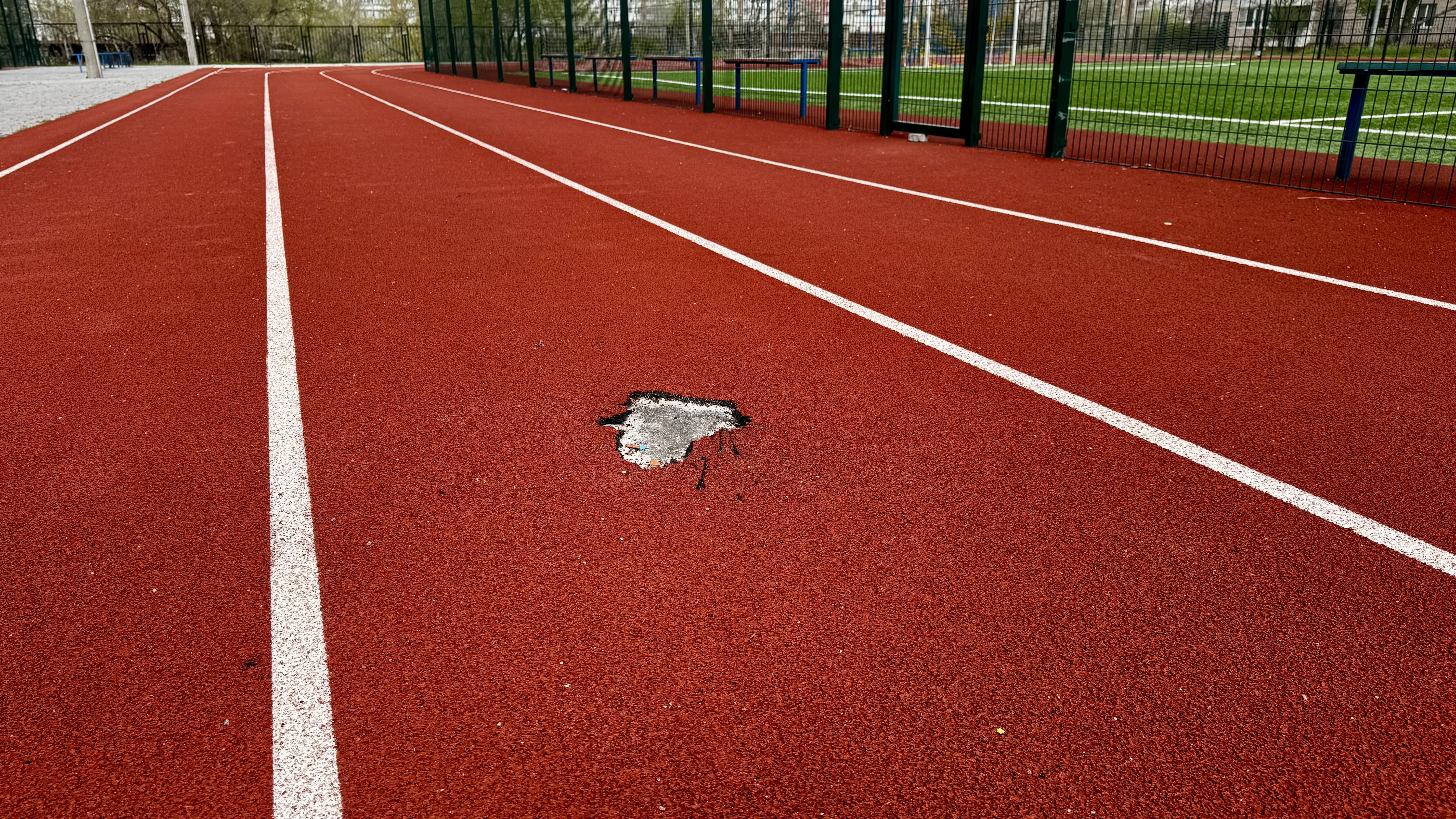Не дивлячись на пронизливий вітер, на вулиці сяє сонце. Через що червоний колір покриття здається ще насиченішим, наче новий. Однак пройшовши далі, бачимо, що доріжку попсував уламок БПЛА. Аркадій Григорович на мить засмучується, та потім махає рукою: «Це все нічого. Зробимо! Залатаємо!».
