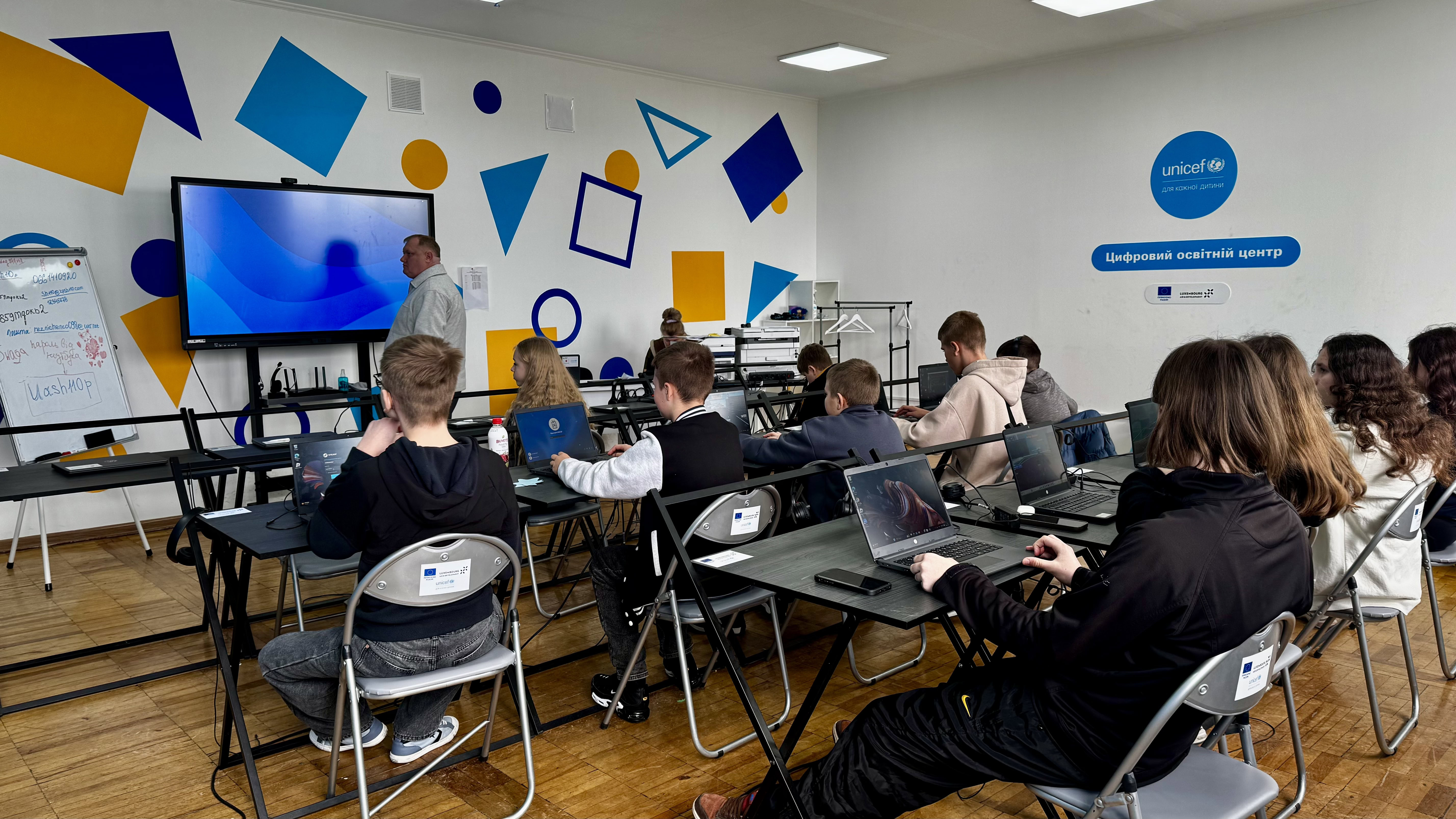 В школі з 9 до 5 працює Центр надолуження освітніх втрат. Якщо не знати куди потрапив, то спочатку здасться, що це комп’ютерний клас. Парти виставлені в три ряди та на кожній по ноутбуку.