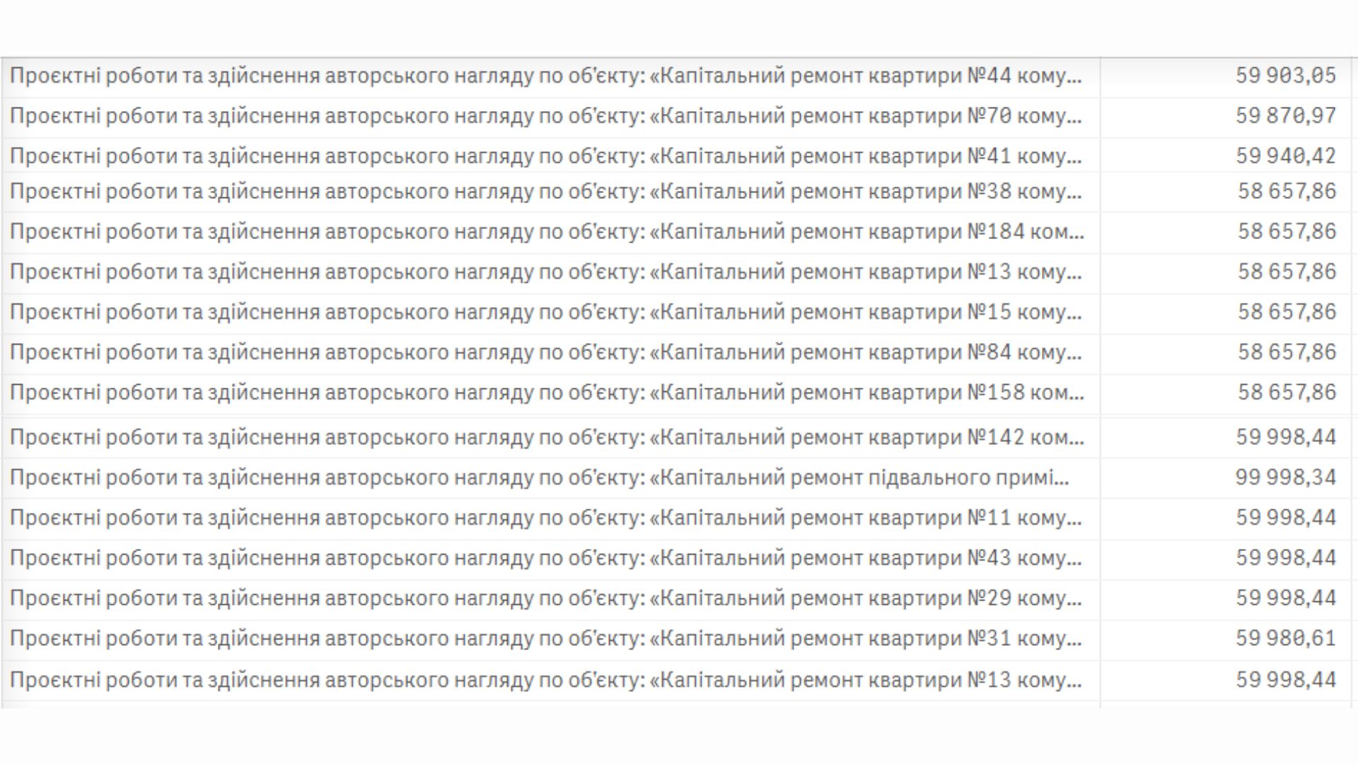 Закупівлі на капітальний ремонт у межах однієї квартири проводилися без торгів, оскільки вартість не перевищувала 1,5 млн грн – граничну суму для прямих договорів. Мінімальна ціна ремонту становила 500 тис. грн, максимальна – майже 1,3 млн грн. Підряди отримали: