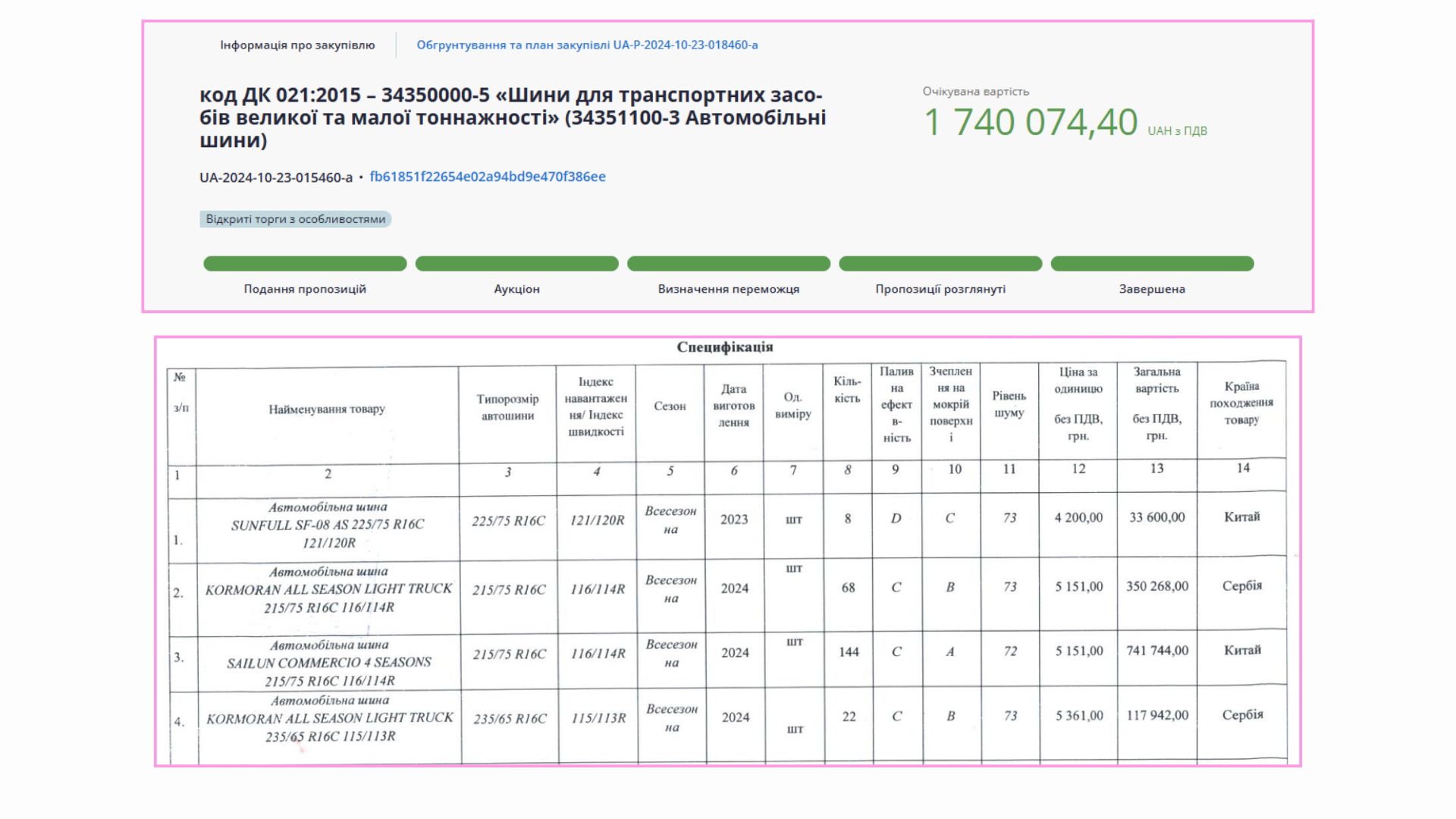 Закупівля шин для автопарку «Територіального медичного об’єднання – обласний центр екстреної медичної допомоги та медицини катастроф», оголошена у жовтні 2024 року, стала підставою для масштабного кримінального провадження. Йдеться про контракт вартістю 1,7 млн грн, за яким медцентр мав отримати 282 автомобільні шини від київської фірми «ТД “Трейд Сіті Сервіс”».